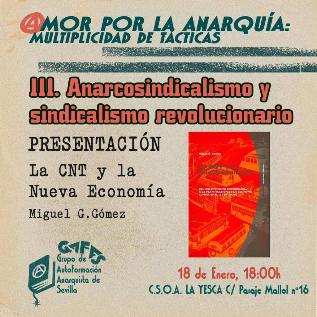 En el primer encuentro nos centraremos en la economía colectivista y confederal de la mano de Miguel Gómez para ahondar en el proceso revolucionario que capitalizó la C.N.T. a partir del verano del 36. Cómo se fraguó la revolución social en su aspecto económico de la mano de la Confederación Nacional del Trabajo será la cuestión central que trataremos en esta sesión con la intención de aprender de las experiencias pasadas.