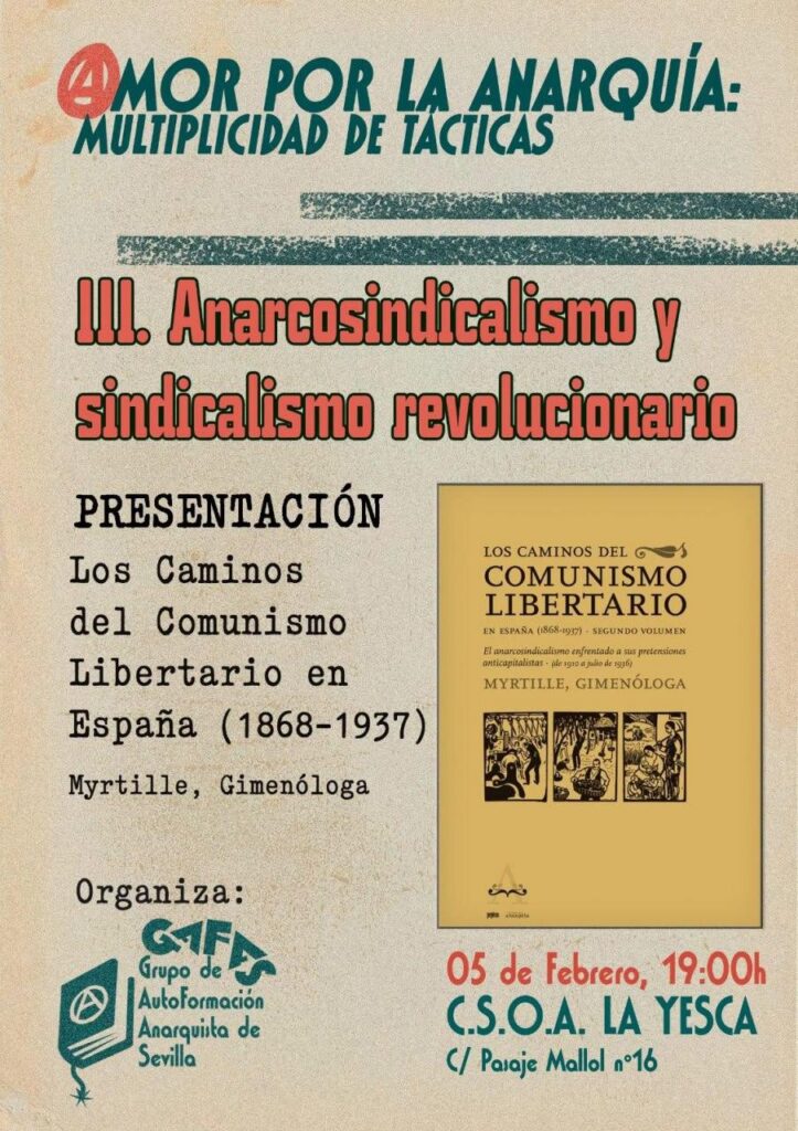 Desde la Asamblea Anarquista de Sevilla hemos querido hacer un ciclo completo para recordar de dónde venimos, pero sobre todo para reflexionar sobre a dónde vamos. Desde la convicción absoluta de que no podemos dejar que el anarquismo abandone su razón de ser y quede relegado a meras cuestiones culturales e identitarias hemos querido concentrar muchas de las tendencias que ponen en el centro la praxis revolucionaria para volver a darles luz, y que nos iluminen la lucha en nuestros próximos pasos.