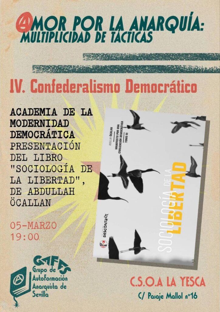 Después de la sesión con Rojava Azadi tendremos la suerte de contar con compas de la Academia de la Modernidad Democrática para hablarnos de la obra de Abdullah Öcalan titulada «Sociología de la libertad».